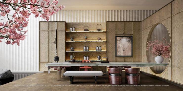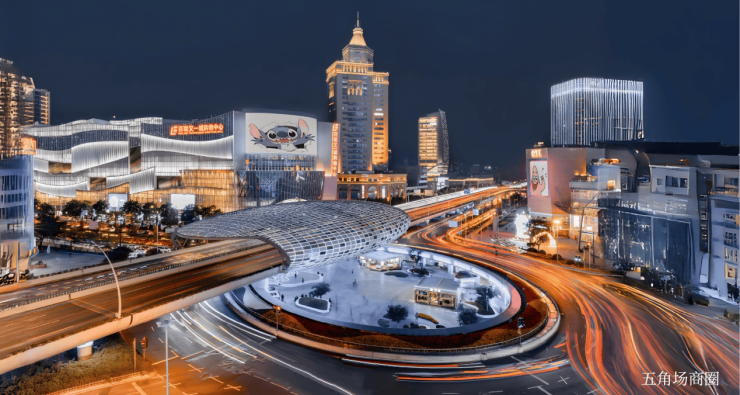 繁花立面:玉兰冠顶、曲面柱廊、金斗迎门等勾勒建筑轮廓;高定铝板、米黄石材与弧形玻璃幕墙,在丝箔流金、东方雅铜、青釉奢蓝点缀下,构筑海派美学建筑群。