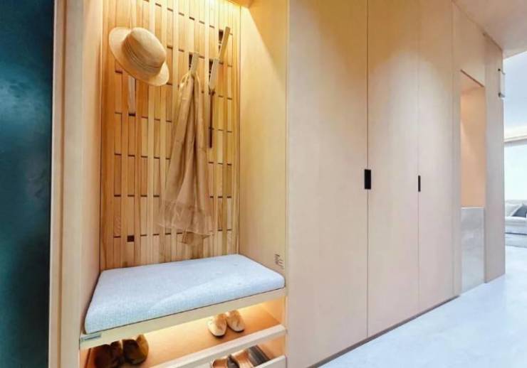 进门玄关的设计,藏着对“便捷生活”的细腻考量:坐凳上方的衣帽区,配备可灵活调节的挂钩——长衣、短衫、帽子、丝巾皆能找到专属位置,避免进门后衣物堆积的杂乱。