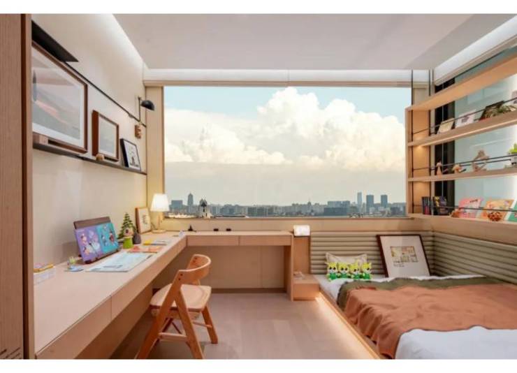儿童房的设计完全围绕 “成长” 展开:靠窗的升降书桌,通过智能操控就能从 70cm(适合 6 岁孩子)调到 90cm(适合 16 岁青少年),桌面面积够大,放得下课本、电脑和台灯。