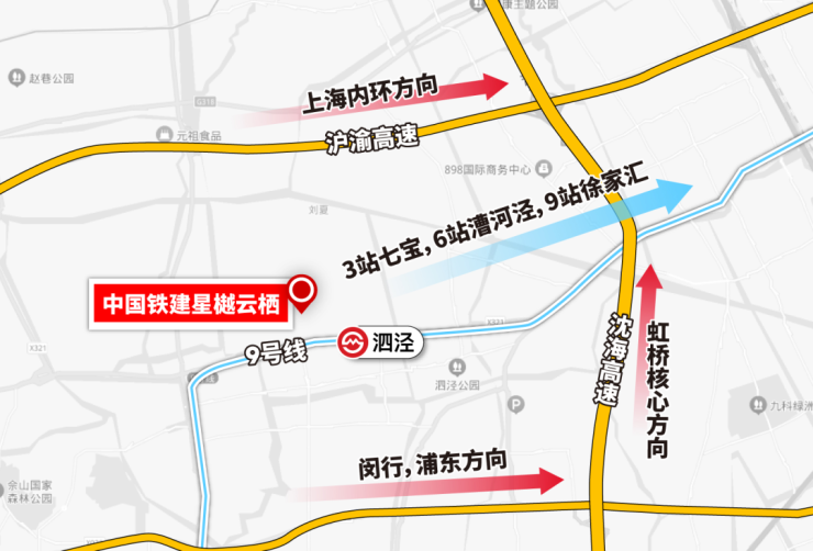 6站约24min直达漕河泾、9站约33min直达徐家汇,通勤幸福感UP。一条9号线,让泗泾实现了与漕河泾、徐家汇同城化,形成了一个高效率的产城融合体。