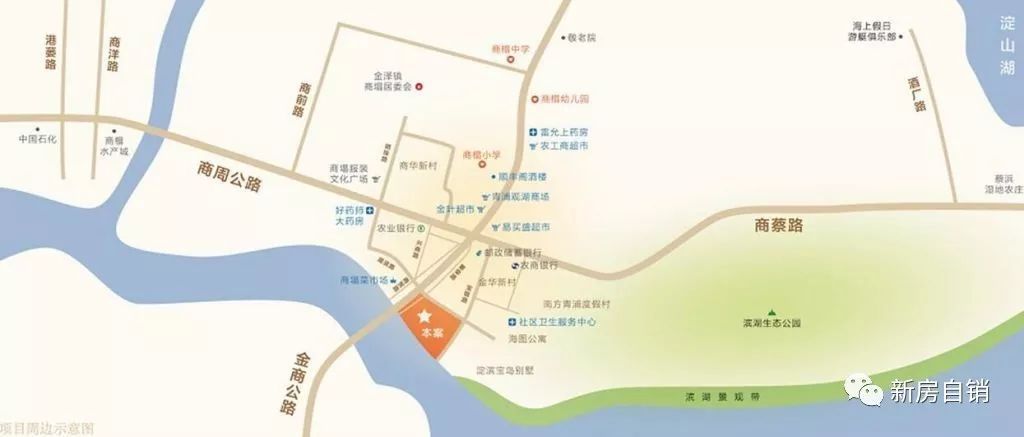 观湖御景位于上海淀山湖生态风景区的商榻镇 。商塌的地形从区位图上可以看到,就像深入淀山湖中心的半岛,是上海具有悠久历史的水乡古镇。 上海罕有真正淀山湖临湖住宅项目,三大4A5A景区环绕:周庄古镇 锦溪古镇 肖甸湖森林公园 ; 开车约20分钟可至朱家角、周庄、锦溪、同里等景区。约30分钟享青浦新城生活圈,约1小时可至上海市中心生活圈。