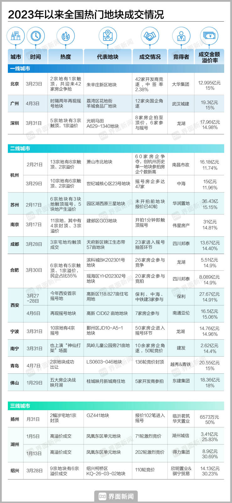 进入2023年以来,随着经济预期好转,全国楼市活跃度提升,土拍也随之升温,以北京、广州、杭州、南京、成都为代表的多个城市多数地块竞争激烈,部分地块的房企报名数甚至创历史新高。