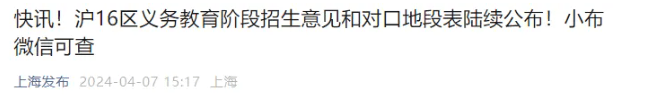 4月7日,上海各区教育局公布了2024年义务教育招生实施方案和招生细则,包括公办小学划片范围、公办初中对口方式、民办学校招生计划、本市户籍人户分离实施细则等。
