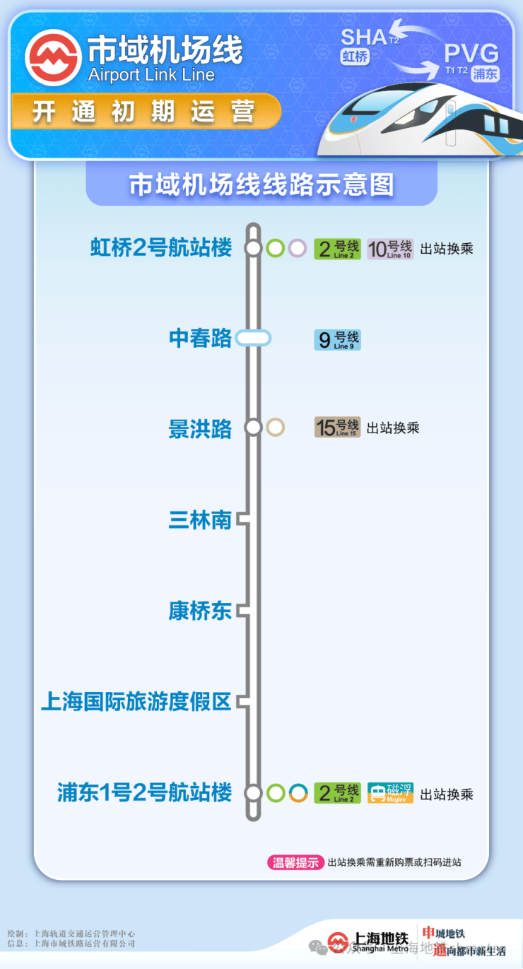 市域机场线初期运营里程约59公里,共设车站7座(依次为虹桥2号航站楼站、中春路站、景洪路站、三林南站、康桥东站、上海国际旅游度假区站、浦东1号2号航站楼站),其中虹桥2号航站楼站、中春路站为地面站,其余均为地下站。站内换乘车站1座、出站换乘车站3座(出站换乘车站不享受连续计费,需重新购票进站)。