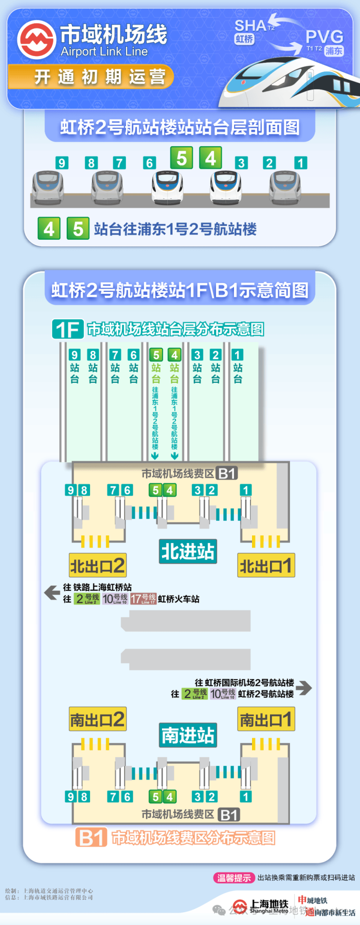 提请乘客注意的是,市域机场线列车编组有4节和8节两种形式。乘客候车时,请务必留意车站广播,并依据站台门及地面的指示引导信息,准确前往不同编组列车停靠的站台门位置,等候列车进站。此外,虹桥2号航站楼站和浦东1号2号航站楼站均存在两侧站台轮流发车的情况,请乘客留意车站广播和站台信息显示的发车时间,以免耽误行程。