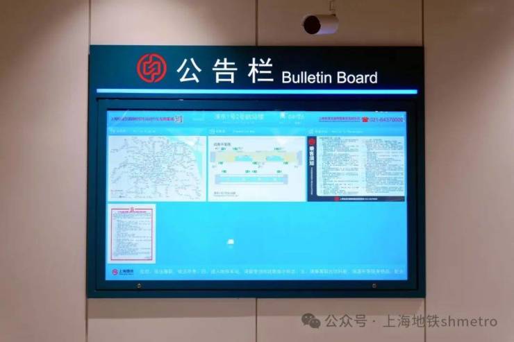 所有车站出入口处均使用电子公告栏。地面站站台门上设有信息显示屏,地下站信息显示屏则设置在站台门上方,实时显示列车进站信息、等候时间、列车拥挤情况等便民候车信息。除虹桥2号航站楼站、浦东1号2号航站楼站,其余车站在站厅出入口处均设有公交信息显示屏,方便乘客及时掌握周边公共交通信息,合理规划行程。