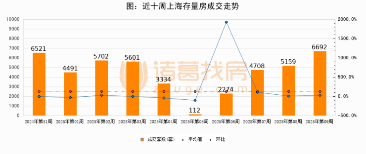 存量房方面,第09周上海存量房成交6692套,较上周增加1533套,环比上涨29.7%。从近十周成交走势来看,周均成交套数为4459套,本周高于平均水平50.1%。