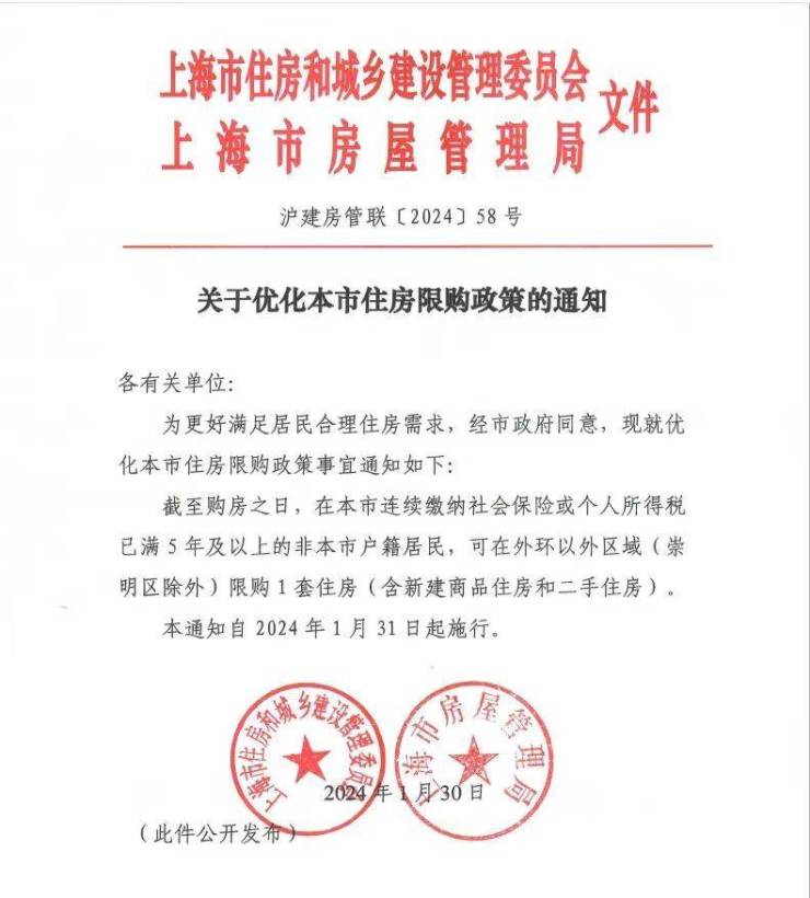 1月30日,上海市住建委、上海市房屋管理局联合印发《关于优化本市住房限购政策的通知》。