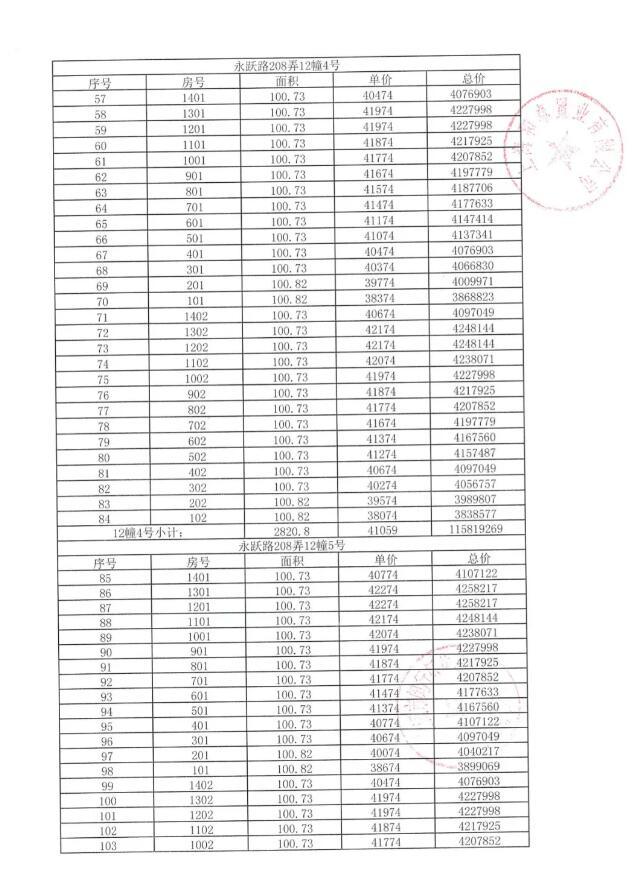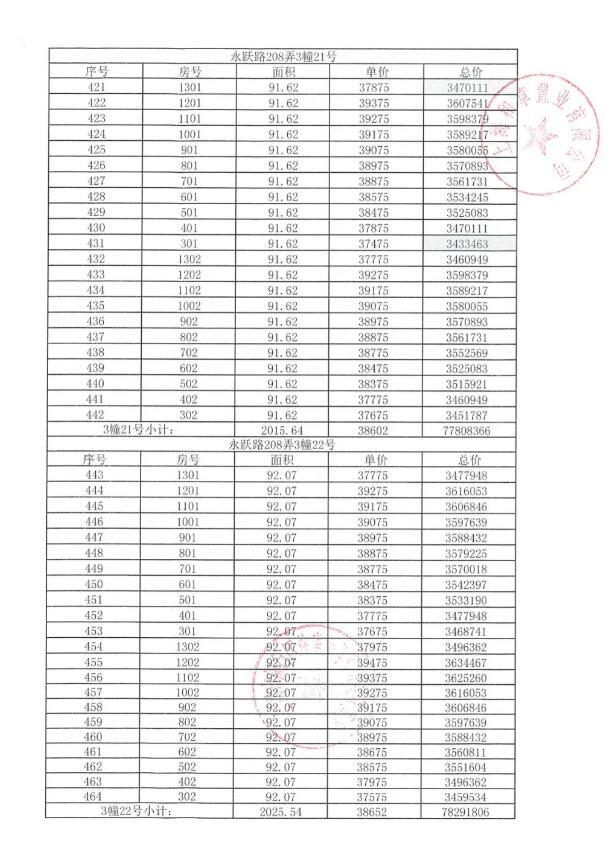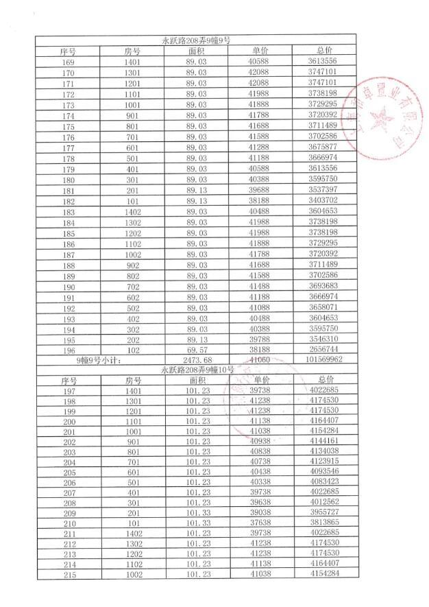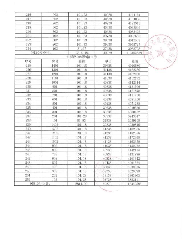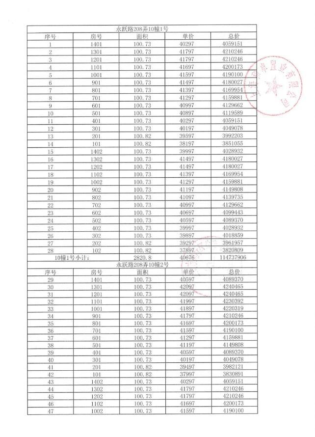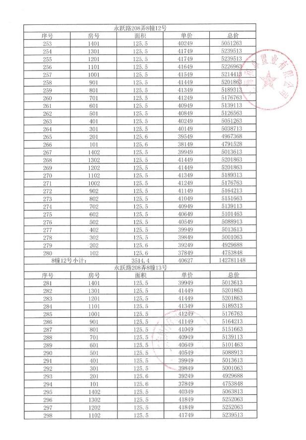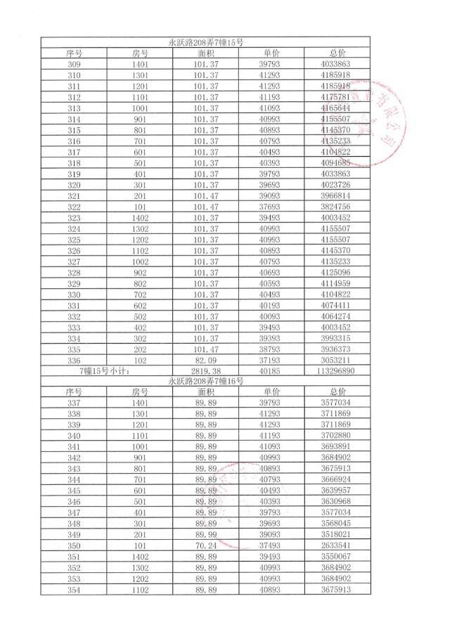 附一房一价表: