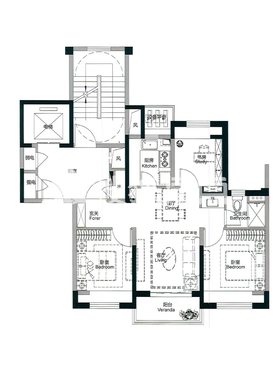 户型亮点:南北通透,三开间朝南,两个卧室中间由客厅隔开,均设有宽敞的阳台。