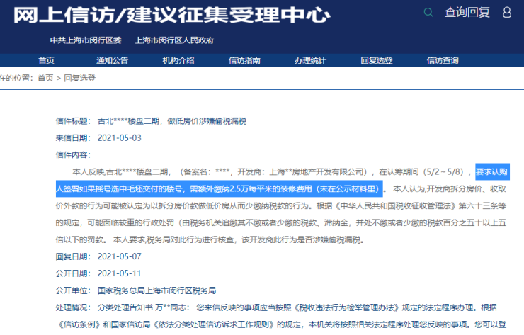 一份业主举报信,或许就道出了开发商违规操作的真相。据认筹业主举报,古北中央公园认筹期间(5/2~5/8),要求认购人签署如果摇号选中毛坯交付的楼号,需额外缴纳2.5万/㎡的装修费用(未在公示材料里)。业主认为,开发商拆分房价、收取价外款的行为可能被认定为以拆分房价款做低价房从而少缴纳税款的行为,并向国家税务总局上海市闵行区税务局举报。