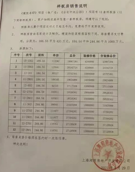 根据上面这份加盖公章的 “样板房销售说明”显示,古北中央公园共计12套样板房出售,客户须绑定装修包购买。其中2套建面约166.55㎡房源,总价约2000万元,装修价格为420万元,还有10套建面约184.54、244.86㎡房源,总价约1570-2712万元,装修价格都为清一色的1000万元整,而且均要求每套装修价格须在签约时一次性付清。
