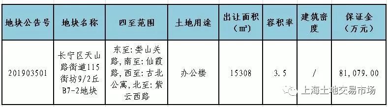 2019年5月6日,上海市土地交易市场举行长宁区天山路街道115街坊9/2丘B7-2地块国有建设用地使用权挂牌截止及现场竞价活动,最终一家香港公司经过近1个小时的激烈竞拍后以24.2亿元总价溢价49%夺得该地块,成交总价较起拍总价高出近8亿元,成交楼板价超过4.5万元/㎡。