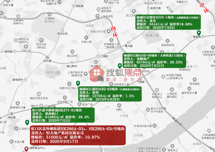 虹口今年7月3日出让了一幅纯宅地——虹口区嘉兴路街道HK271-01地块,由招商蛇口竞得,成交楼板价81089元/㎡。当时地块竞拍过程记录,7家竞买人总计报价187轮才分出胜负。这幅纯宅地与今日成交地块直线距离约800米。此次恒大地产竞得的地块含有商业、办公和住宅,所以整体楼板价相对较低。