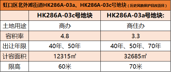 虹口区北外滩街道HK286A-03a、HK286A-03c号地块东至旅顺路、南至东大名路、西至溧阳路、北至东长治路,为商办+商住办混合地块,总出让面积12545㎡,其中HK286A-03c号地块为商办用途,容积率4.8,计容面积12315㎡;HK286A-03a号地块为商住办用途,容积率3.3,计容面积32685㎡。地块住宅全装修面积100%、中小套比例不低于70%。