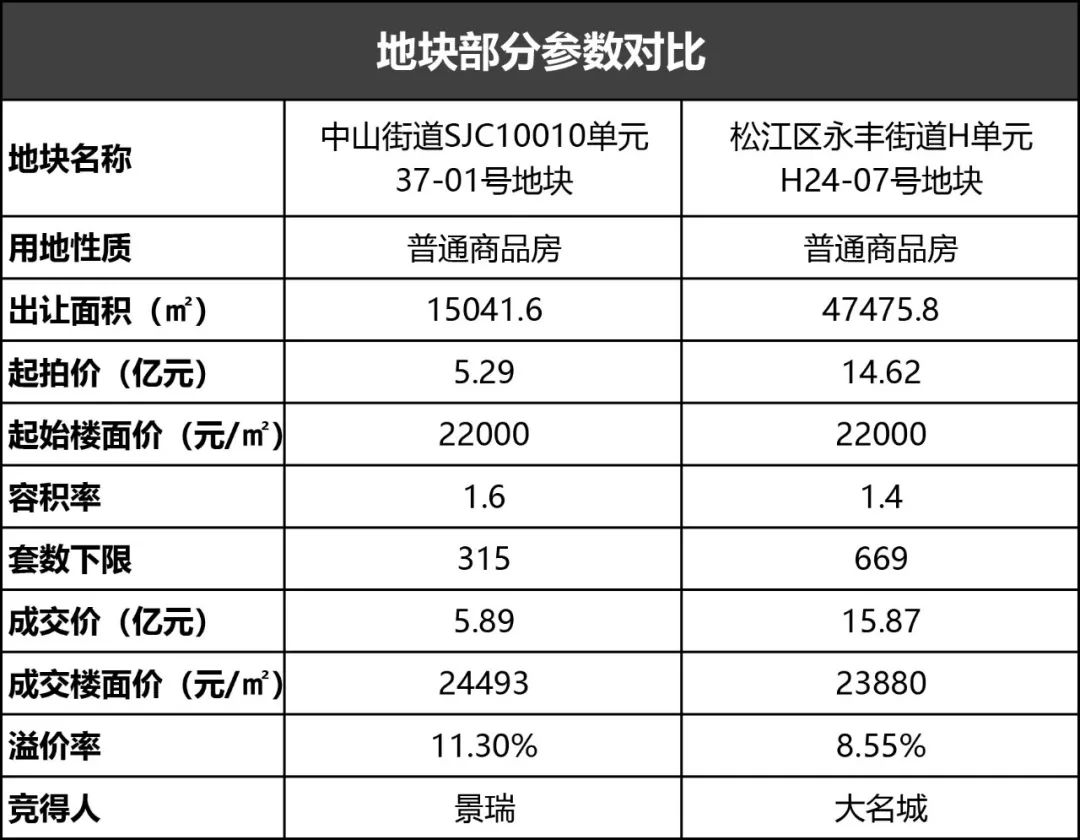 小结:两个项目的起拍价格均是2.2万/㎡,但最终却分别被景瑞与大名城以11.33%及8.55%的溢价率摘得,成交楼面价相差613元/㎡。