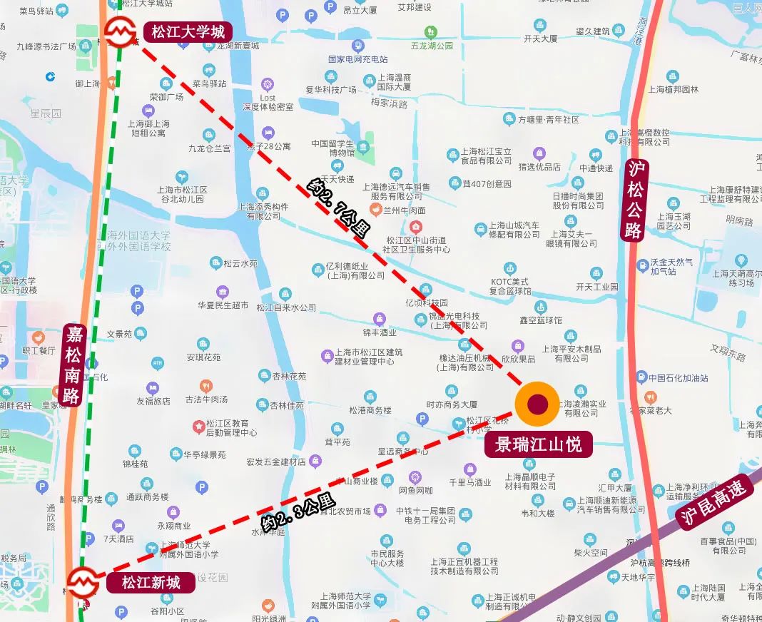 景瑞江山悦位于茸树路500弄,处于茸北路、茸树路交界,靠近9号线松江大学城站与松江新城站,直线距离分别为2.7公里、2.3公里,主要依靠公交接驳。