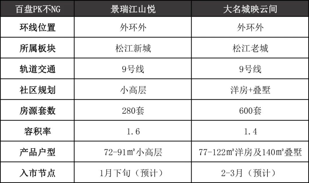 最终对比,到底是地处松江新城的景瑞江山悦更占优势?还是位于松江老城的大名城映云间更胜一筹?