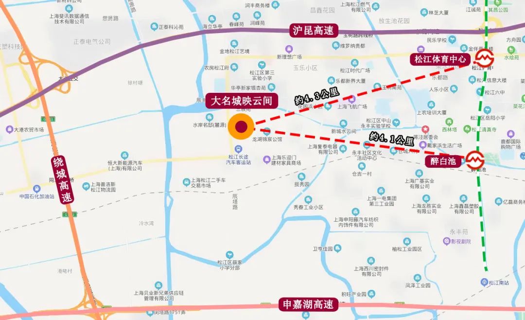 大名城映云间位于辰塔路与永隆路交汇处,项目附近轨交为9号线醉白池站与松江体育中心站,直线距离分别约4.1公里、4.3公里。