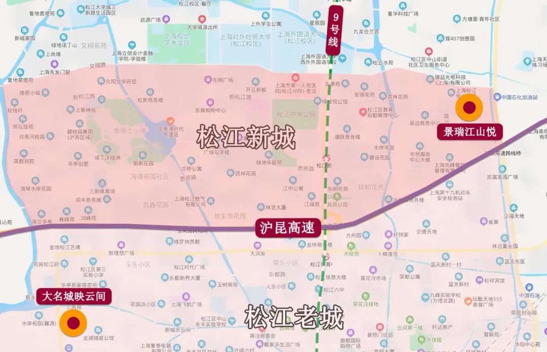 以两个项目周边3公里范围内的商业、教育、医疗等配套资源的分布情况来看,地处松江新城板块的景瑞江山悦相比于位于老城板块的大名城映云间,无论是距离上述配套的直线距离,还是相关配套的体量及等级方面都更具优势。