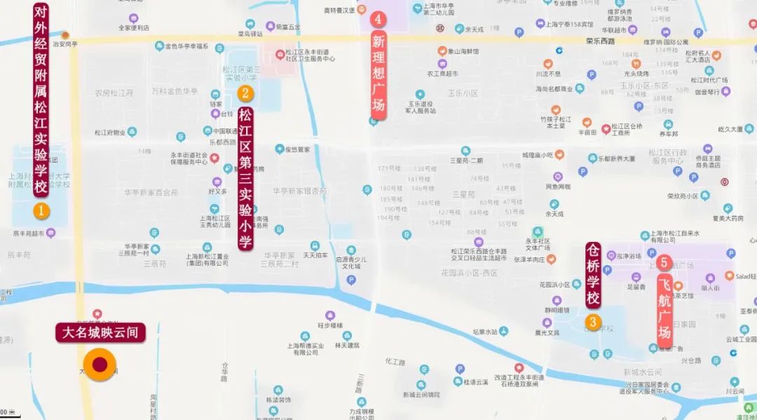 教育配套方面:项目周边同样2公里范围内有松江区第三实验小学、上海对外经贸大学附属松江实验学校、仓桥学校等学校。(仅作为距离参考,不视为学区承诺,对口情况以当年度教育部门公示为准)