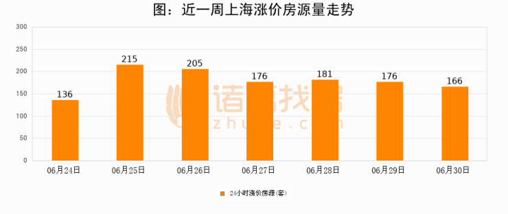 根据诸葛找房数据显示,上海24小时涨价房源量为166套,较06月29日减少10套,环比下降5.7%。与此同时,涨价房源占比小幅回落,对于购房者来说是一个入市窗口期,购房者可抓住时机入市。