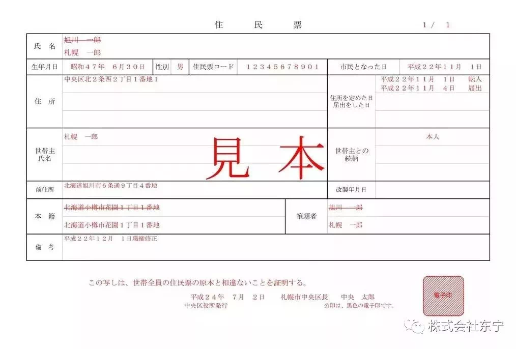 住民票是日本最常用的户籍文本,它以每个人的居住地为基础设立,上面标有此人的姓名、出生年月日、性别、与户主的关系等。住民登录制度通过掌握全体国民的住址信息来实行管理。每个居民有一张住民票,由地方政府保管。