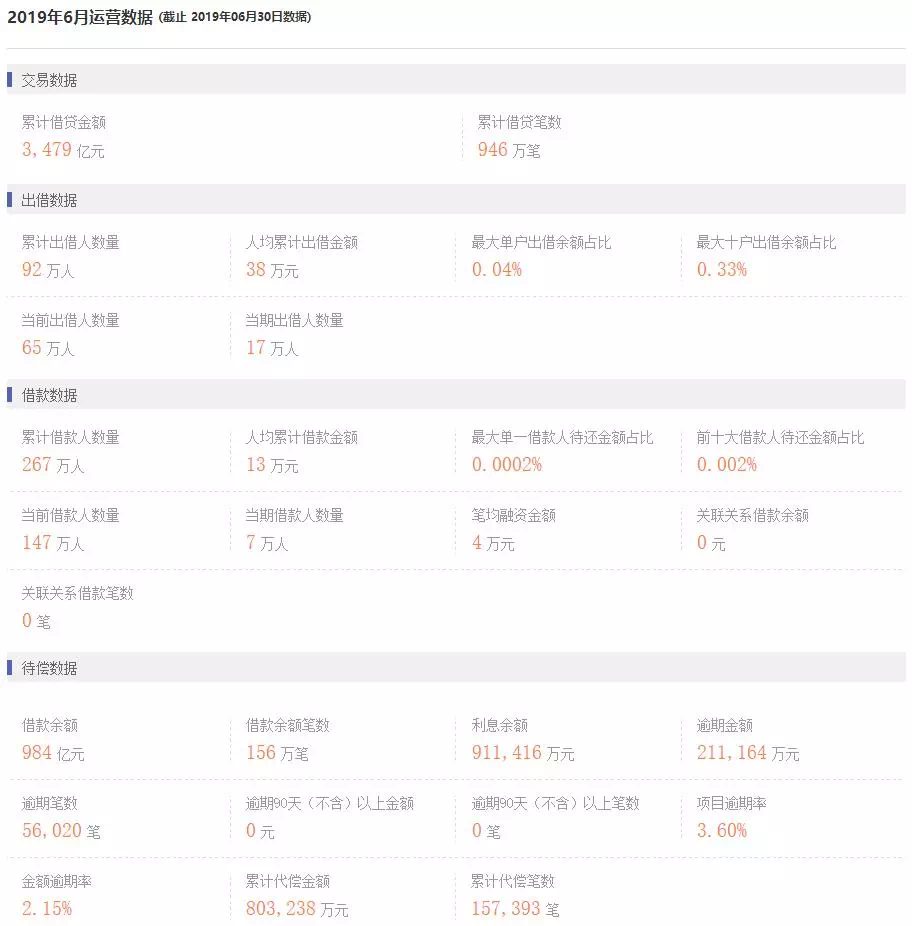 根据官网显示,截至2019年6月30日,陆金服借款余额984亿元,当前出借人数量为65万人,当前借款人数量为147万人,累计借贷金额3,479亿元,累计借贷笔数946万笔。