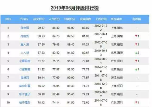 网贷之家每月发布的《2019年6月P2P网贷评级TOP60排行榜》。评级报告显示,陆金服、拍拍贷、宜人贷、人人贷、小赢网金、玖富普惠、微贷网、麻袋财富、积木盒子、桔子理财,分列发展指数排名前十。