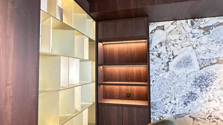 全铝可塑性强、稳定性强,让设计师的每一笔都可以还原落地,让设计图上的每一个弧度、异形都可以呈现,模块化安装工艺避免了传统板材的变形问题。无论是客厅的弧形背景墙,还是酒柜的造型,最终呈现的效果与效果图实现接近1:1还原。这不是巧合,而是嘉斯顿对“设计落地”的硬核承诺。