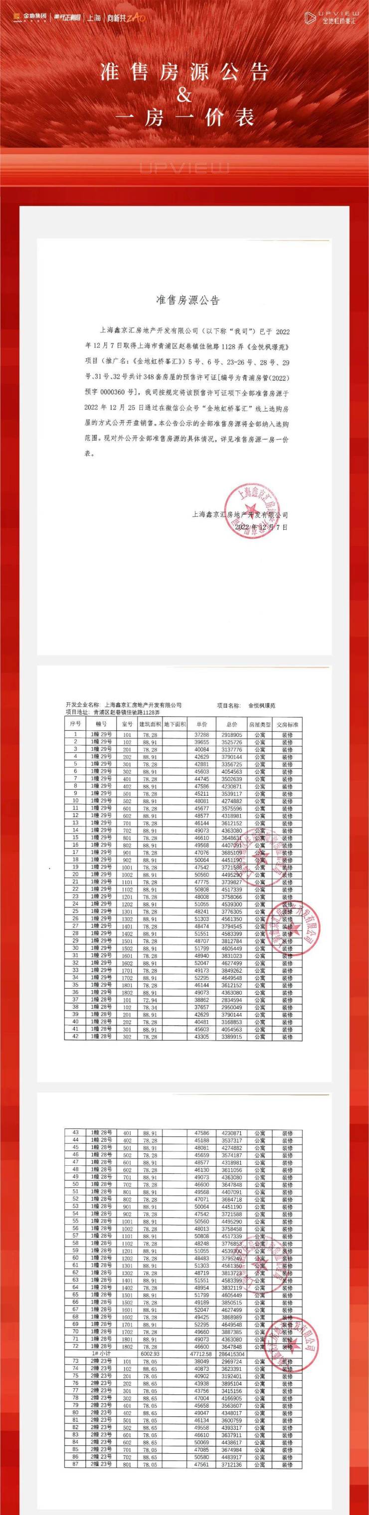 金地虹桥峯汇二期348套收官房源已取证,12月9日开启认购。
