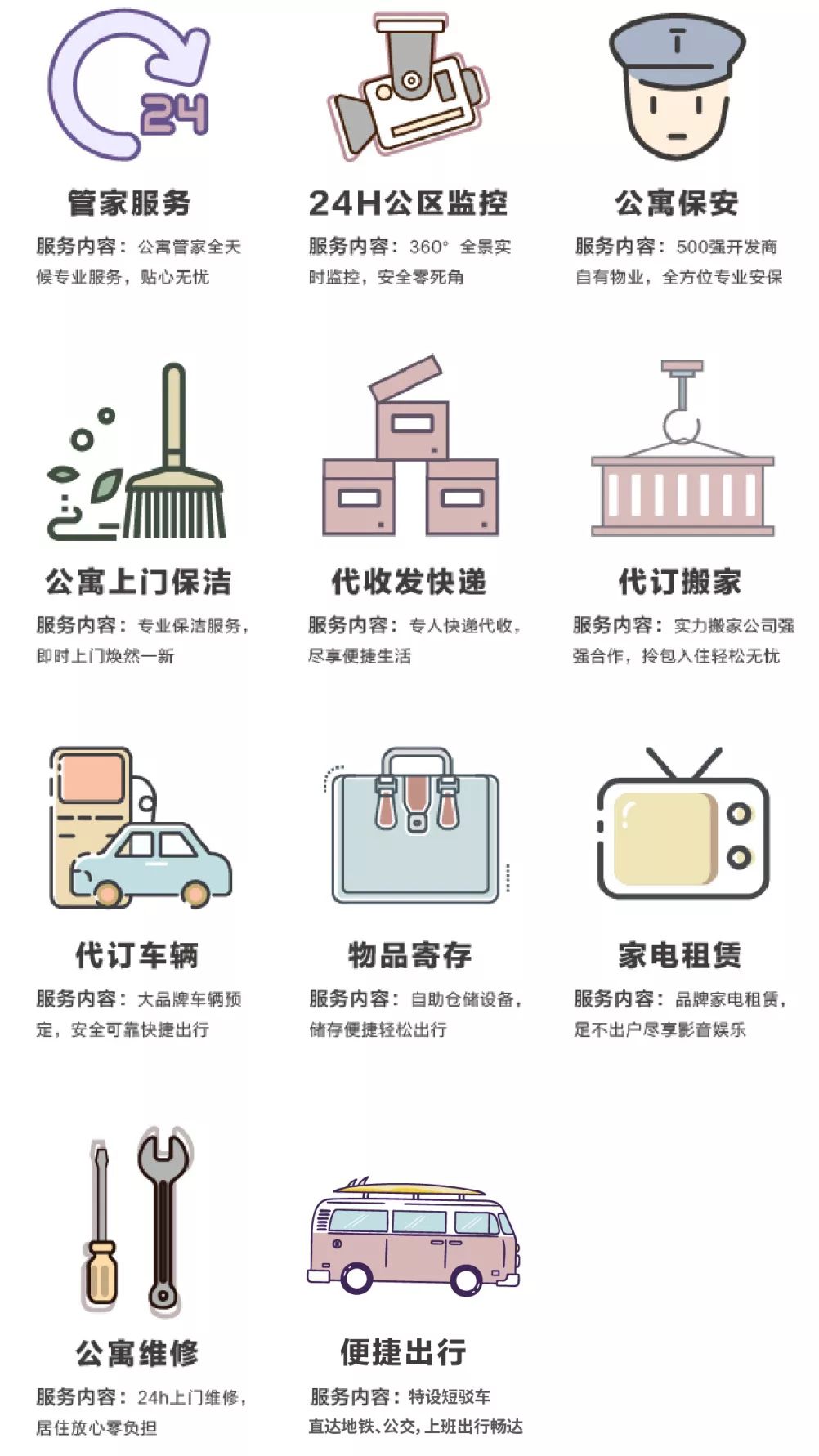 除了高品质的公寓房间,菁舍的增值服务也非常贴心。专属管家服务、24小时保安巡逻与监控配备,让你的安全有保障;上门保洁、公寓维修、特设短驳车,直达地铁公交,还有定期特色主题活动,丰富潮趣!