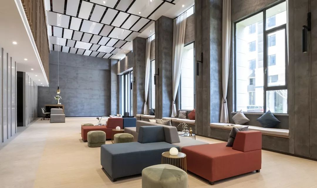 踏入菁舍门内,瞬间被整体设计风格所吸引,以灰色为主色调的大堂简洁大气,阳光从通透的落地窗洒进空间,又多了温暖的氛围,而大堂内多元化的材质,给人感觉舒适、美好。