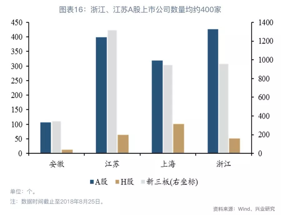 华东地区的直接融资比例占比大幅高于全国平均,上市公司众多。融资体系上,江浙沪地区直接融资占比约20%,长期高于全国约15%的平均水平。从上市公司数量来看,2018年8月,浙江江苏A股上市公司数量均约400家,分别占A股上市公司总数量约12%。新三板挂牌企业数量约1000家、1300家。从地区A股市值/GDP规模来看,2017年末,上海市、浙江省该比例分别约为200%、90%,超过国内约76%平均水平。江苏省、安徽省地区A股市值/GDP规模均不足50%。