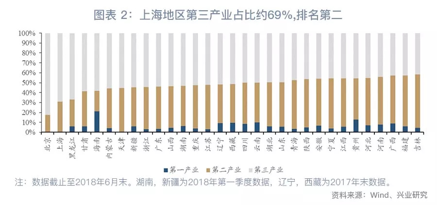 产业结构来看,江浙沪三地的排名前列产业占比均不足3%,第三产业发达。2018年6月末,上海地区第三产业占比较高,约69%、排名前列产业占比不足1%,形成以现在服务为主体的产业结构。浙江、江苏省次之,安徽省整体的第三产业结构占比则属于全国中下游水平。
