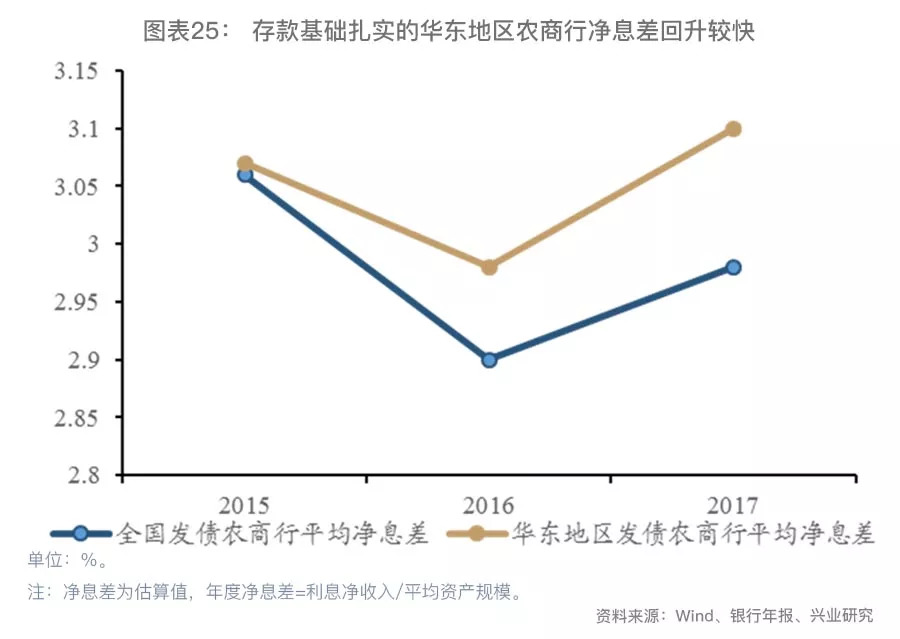 净息差:强于全国平均水平。从净息差的特别水平来看,华东地区城商行农商行盈利能力强于全国平均水平。2017年,华东地区发债城商行,农商行平均净息差2.26%、3.1%,高于全国口径7BP、12BP。从近三年净息差变化趋势来看,2015-2016受降息周期外部环境影响,区域银行整体净息差呈收窄趋势。2017年受流动性环境改变,负债端更依赖金融市场融资的华东地区城商行在2017年净息差收窄趋势更明显,较上年收窄38BP,而华东地区城商行凸显负债端存款占比高,成本稳定的优势,净息差上升12BP。