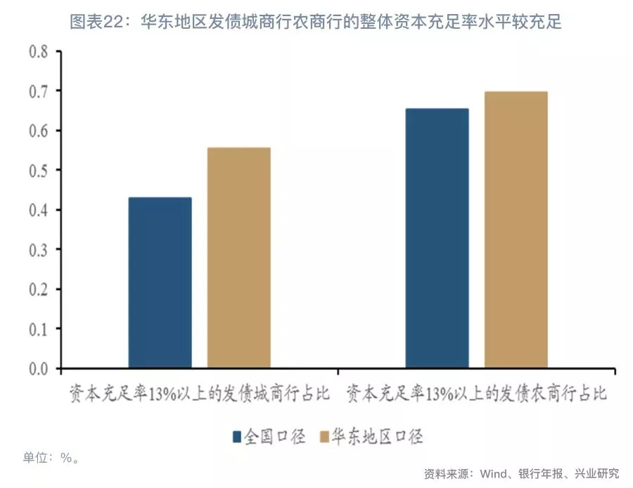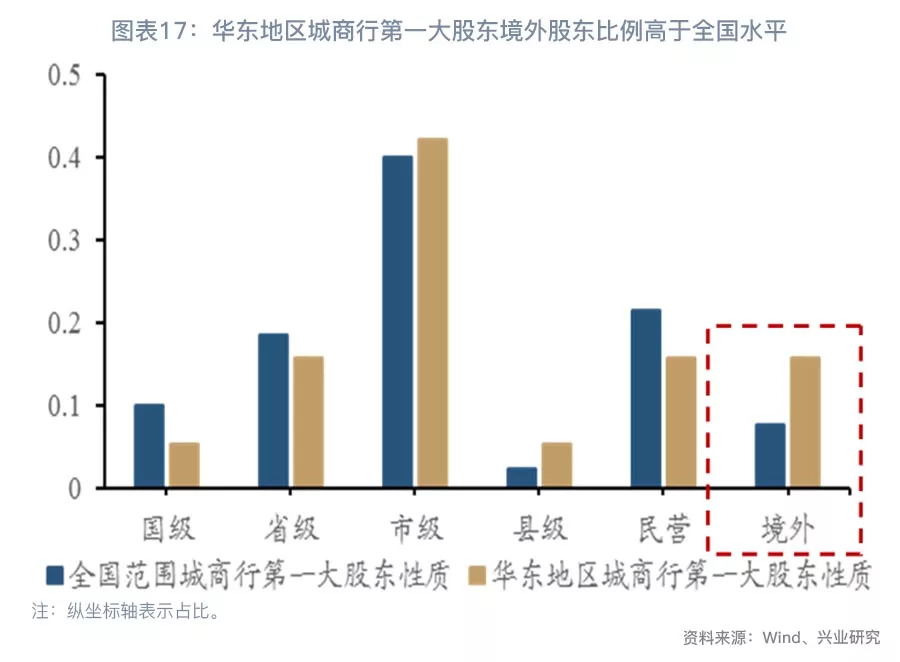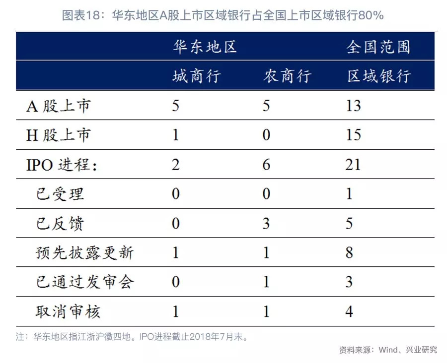 治理结构:股权受境外投资者青睐,上市银行比例高。从股东性质来看,与全国整体情况一致,农商行民营股东占比高于城商行,城商行国有股东以市级背景为主。此外,华东地区城商行在中境外股东比例16%高于全国7%的水平。从上市情况看,华东地区中小银行上市比例高,截止2018年7月末,华东地区A股上市区域银行占全国上市区域银行80%,排队上市的区域银行8家,占总申请银行38%。