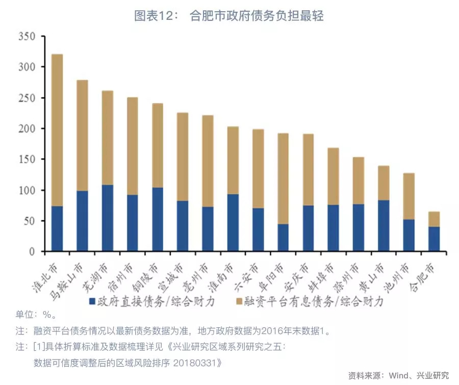 安徽省内债务负担以融资平台债务为主。淮北、马鞍山市债务负担最重,广义债务率约300%,其中折算融资平台有息债务/综合财力200%左右。除合肥外的芜湖、宿州、铜陵市等广义债务率在150%-250%左右。省会合肥政府债务负担较轻,约64%左右。