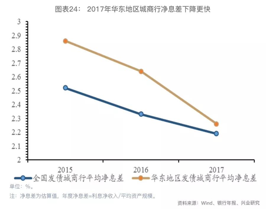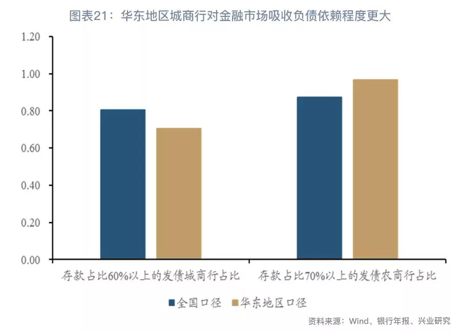 当前流动性宽松环境下,同业融资成本快速下降有利于压缩负债成本。但华东地区城商行的负债端存款基本相对较弱或影响流动性指标达标。2017年末,约27%的华东地区城商行测算的流动性匹配率指标小于100%,占比略高于全国口径下23%。