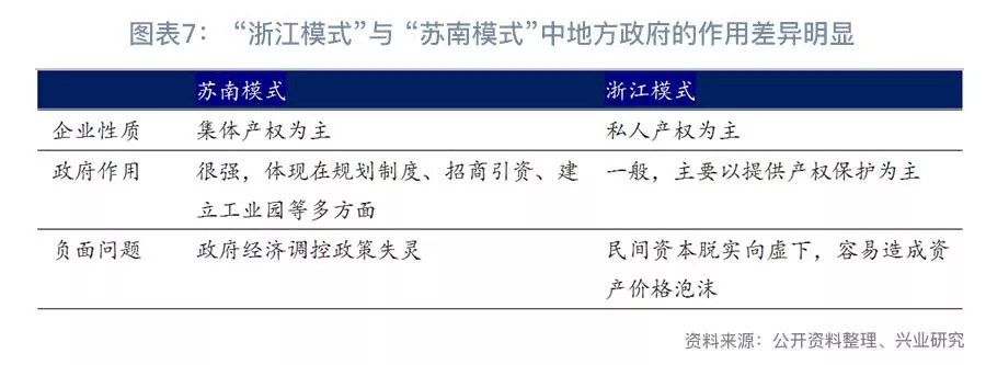 江浙两地整体经济水平处于全国上游,但具体经济特征存在较大差异。具体来看,“浙江模式”以发展个私经济为主的发展模式;而“苏南模式”就是以发展乡镇集体企业为主的模式。地方政府在“苏南模式”作用体现在规划制度、招商引资、建立工业园等多方面,干预和领导能力较强,也存在地方债务负担重,经济调控政策失灵风险。浙江模式中“小政府”管理下,政府以提供产权保护为主,民间资本自行发展空间较大,但在经济不景气,货币宽松的环境下,也容易造成资产价格泡沫。