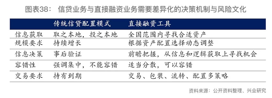 信用债及权益等直接融资工具市场价格波动较高,这与银行传统信贷配置模式不兼容,这需要差异化的决策机制和风险文化。如一般信贷业务一般有单独的信息获取途径,采取非标准化运作并严格控制不良,直接融资业务需要更广的交易范围、更靠前的信息获取模式、更能容错的风险文化。