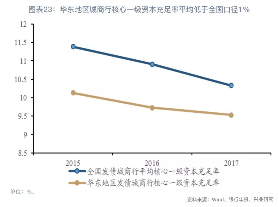 杠杆水平:城商行维持高杠杆运行,补充资本需求较强。从资本充足率来看,华东地区发债城商行农商行的整体资本充足率水平较充足,截至2017年末,约56%、70%的华东发债城商行农商行资本充足率超过13%。但从核心一级资本情况,华东地区城商行长期维持高杠杆水平,近三年核心一级资本充足率平均低于全国口径1%。