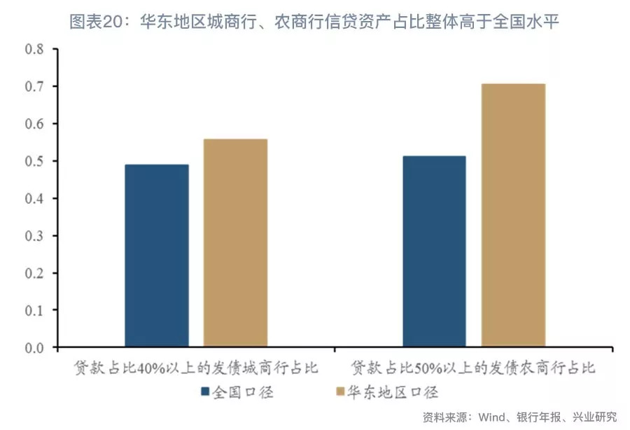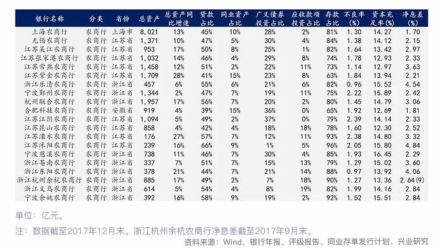华东地区城商行在上世纪90年代中后期末率先改制重组,吸收合并省内城信社,整合银行资源。安徽省徽商银行在2005年正式更名,并在合肥城商行基础上吸收省内5家城商行及7家城信社,经过调整最终安徽省省内整合成为1家城商行,类似还有江苏银行等。浙江省、江苏省则是以单个城市为范围进行整合如南京银行等。农商行则是整体以区县为单位进行整合改制,安徽省、江苏省、上海市地区农信社已率先全部完成农商行改制。2017年末,四地区农商行数量占全国农商行约18%,包含公开资料的发债农商行占比约49%。
