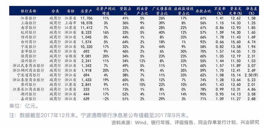 区域特质:全国夜间最亮的区域体现了较强经济发展动力,第三产业占比较高,直接融资比例占比超过20%,这大幅高于全国平均(约15%)。(1)浙江特色民营经济发达,产业集聚下块状经济明显;江苏对政府招商依赖度高,而安徽地区经济发展不平衡;(2)江苏地方政府债务负担重,如城投债规模和融资平台长期居于全国首位,而浙江民营资本发达,在经济不景气且货币宽松时期容易造成资金脱实向虚,相关特征将影响区域银行的经营模式。
