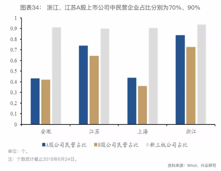 江浙沪地区是我国经济结构转型较快的区域之一,当地传统的低附加值的劳动密集型产业向高科技高质量产业变迁,这也带动了直接融资需求的扩张。华东片区区域直接融资占比在20%以上(全国约15%)。2018年8月,浙江江苏A股上市公司数量约400家,分别占A股上市公司总数量约12%。江浙地区市值在50亿以下A股公司分别占该区域上市数量66%,61%,民营企业占比分别约为70%、90%。信用违约及直接融资工具价格波动风险增加银行进行股票质押、并购贷款等各类直接融资业务的风险。