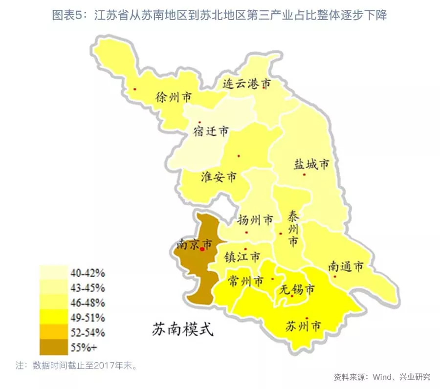 江苏省:江苏省区域上可划分为苏南(南京、无锡、常州、苏州、镇江)到苏中(南通、扬州、泰州)、苏北(徐州、连云港、淮安、盐城、宿迁)。由南向北区域经济发展差距较大,第三产业占比及人均GDP逐渐降低。改革开放以来苏南地区经济发展形成独特的“苏南模式”,即以发展乡镇集体企业为主的模式,这本质上表现政府对区域经济发展控制较强。在经济腾飞之前和初期,市场尚不规整。乡镇企业的所有制结构以集体经济为主,乡镇政府主导与市场调节,并驾齐驱,苏南地区的政府集中动用一切可动用的资源,如招商引资、建立工业园,以招商为手段,以土地换资金。在发展之初有利于促进当地经济的发展,该模式随后推向全省其他区域。