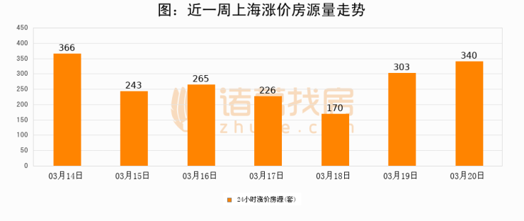 根据诸葛找房数据显示,上海24小时涨价房源量为340套,较03月19日增加37套,环比上涨12.2%。与此同时,涨价房源占比小幅扩大,业主信心有所提升。