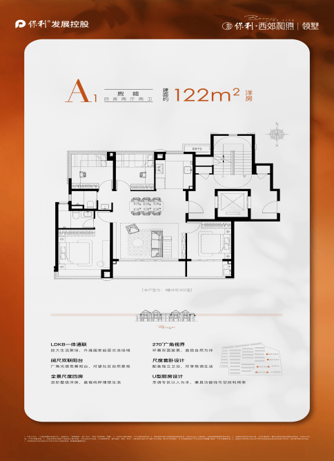 建面约122m²4房2厅2卫墅境洋房,3+1飞机户型,精装交付,南北通透。在延续前期优点的同时,做了诸多细节上的匠心升级!户型以客餐厅为中心点,自然延伸至各个功能间,室内没有多余的过道,几乎没有被浪费的过道面积。双联阳台的突破创新式设计,让整体阳台面宽突破到8.2m,较之常规阳台的整体使用率超出了50%左右;全屋智能升级,搭配控制面板,一键触控智能窗帘、灯光控制及空调、地暖、新风三大件。