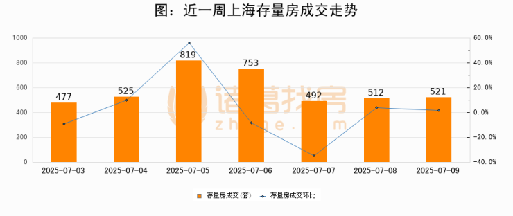 从存量房来看,2025年07月09日上海存量房单日成交521套,比昨日增加9套,环比上涨1.8%。从近一周存量房成交来看,上海存量房日均成交套数为585套,07月09日单日成交521套,低于近一周平均水平10.9%。