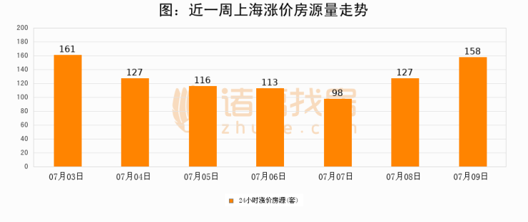 根据诸葛找房数据显示,上海24小时涨价房源量为158套,较07月08日增加31套,环比上涨24.4%。与此同时,涨价房源占比小幅扩大,业主信心有所提升。